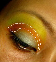 3. Bubuhkan eyeshadow warna merah di sudut luar lipatan mata.